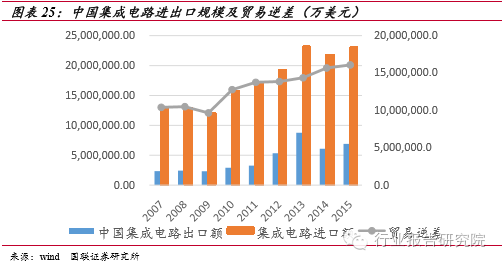 國內(nèi)需求充足,進(jìn)口替代空間巨大。中國集成電路市場規(guī)模雖然大,但不可回避的問題是其自給率偏低。據(jù)海關(guān)統(tǒng)計(jì),2015 年中國集成電路進(jìn)口金額比去年同期增長6%,達(dá)到2307億美元,而出口金額為僅為693.1億美元,進(jìn)出口逆差仍然有1613.9億美元,這表明國內(nèi)有極大的進(jìn)口替代空間。