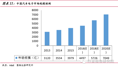汽車電子類產(chǎn)品通常落后消費(fèi)類電子產(chǎn)品一個時期,正如過去幾年手機(jī)行業(yè)所經(jīng)歷的那樣,汽車業(yè)正在由“功能機(jī)”向“智能機(jī)”發(fā)展,這將給電子行業(yè)帶來新的增長引擎。受惠于各國汽車安全政策加持,近期汽車電子輔助行車安全的趨勢已十分明確,越來越多類似TPMS、倒車影像、自動剎車系統(tǒng)等新應(yīng)用崛起。各大車企、互聯(lián)網(wǎng)公司紛紛加快在車聯(lián)網(wǎng)和自動駕駛領(lǐng)域的產(chǎn)業(yè)布局,車聯(lián)網(wǎng)有望成為第一個實(shí)現(xiàn)的物聯(lián)網(wǎng)應(yīng)用空間廣闊,存量與增量汽車市場規(guī)??捎^。2015 年中國汽車電子市場規(guī)模為3,979億元,同比增長12.6%,2013~2015年中國汽車電子市場規(guī)模平均增長率為13.7% 。中商產(chǎn)業(yè)研究院預(yù)測2016年中國汽車電子市場規(guī)模為4497億元。賽迪顧問預(yù)計(jì)到2016年中國汽車電子市場將保持 10%以上的增速,同時汽車電子在整車成本中的占比將超過50% 。我們判斷中國汽車電子市場增長方式正在由汽車產(chǎn)量增長轉(zhuǎn)向功能需求驅(qū)動。