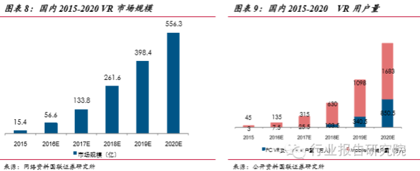 下一代計(jì)算平臺,顛覆眾多傳統(tǒng)領(lǐng)域。預(yù)計(jì)2016年國內(nèi)VR市場增長了近四倍, 之后的增速雖然有所減緩,但是市場的規(guī)模成倍增加。到2020年,市場規(guī)??梢赃_(dá)到556億元,用戶量達(dá)到2500萬,其中PC端用戶量將會突破850萬人,移動端將會達(dá)到1683萬人,出貨量達(dá)到820萬臺,其中PCVR一體機(jī)的出貨量170 萬臺,移動VR出貨量750萬臺,移動端的VR市場爆發(fā)的更加的迅速,市場潛力更大。