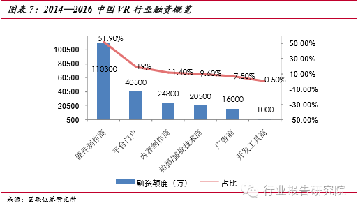 蓄勢待發(fā),爆發(fā)潛能驚人。VR 硬件包括輸出設(shè)備如 PC 端顯示頭戴,移動端顯 示頭戴,以及輸入設(shè)備如手柄,跑步機(jī),動作捕捉識別設(shè)備,全景相機(jī)等。國內(nèi)目前融資最大的一塊就是硬件制作商,占比達(dá)到 51.9%,這也說明了國內(nèi)的 VR市場還處在初期,國外的VR已經(jīng)形成了產(chǎn)業(yè)化,國內(nèi)的市場雖然處于初期但是成長的潛力確實(shí)非常大的。